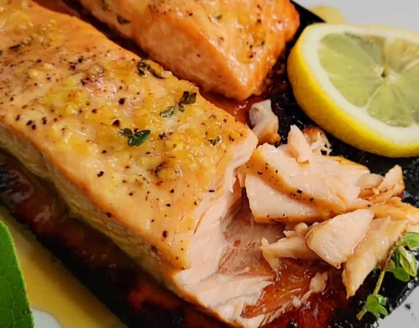 Easy and flavourful grilled Cedar Plank Salmon drizzled with maple garlicky butter sauce and serves with fresh lemon juice and maple syrup.