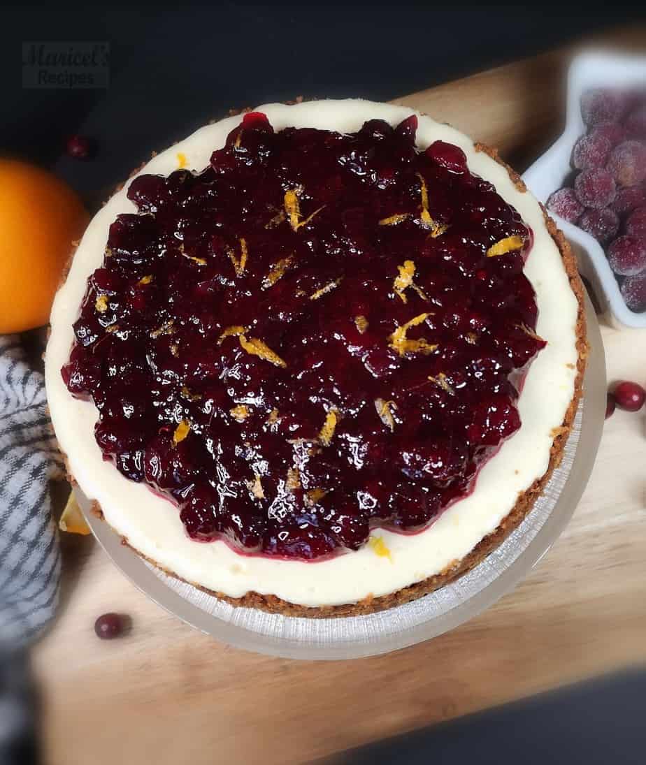 Rich, creamy, and delicious orange flavour cheesecake with sweet and tart cranberry sauce topping.