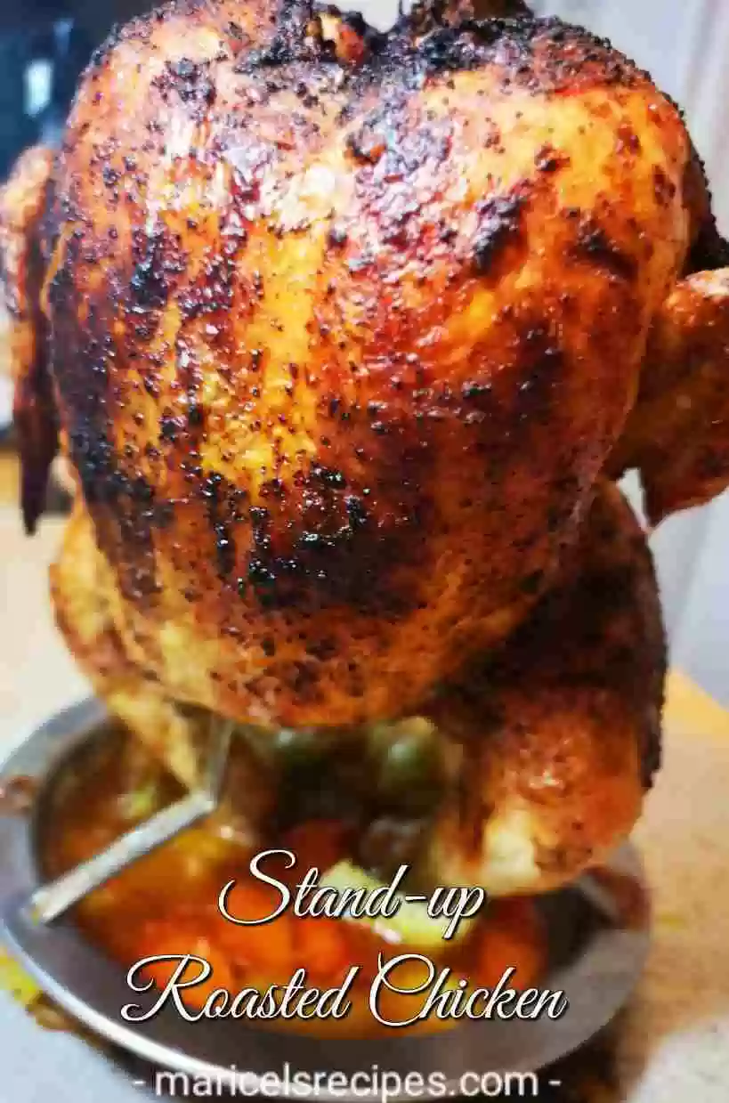 Stand-up, Vertical roasted chicken, or also known as a beer can chicken method can cook evenly on all sides, the skin gets  golden brown and crisp all around while the meat on the inside stays perfectly juicy and moist.